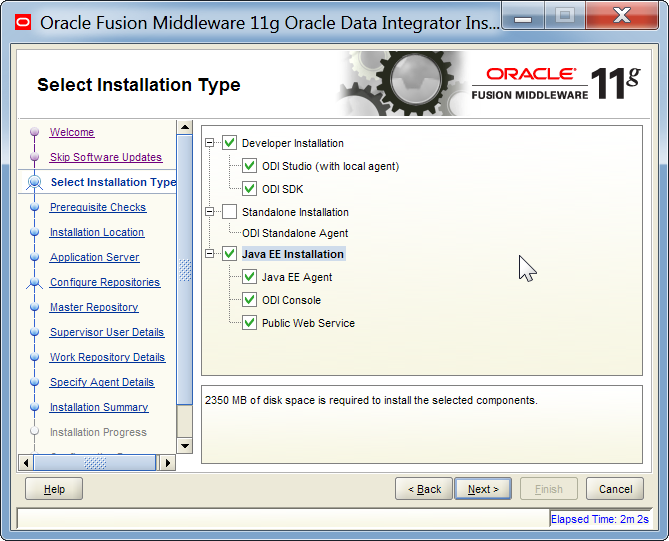 - On the Select Installation Type screen, if you also choose to install ODI Studio, then you must also select the ODI SDK option.
